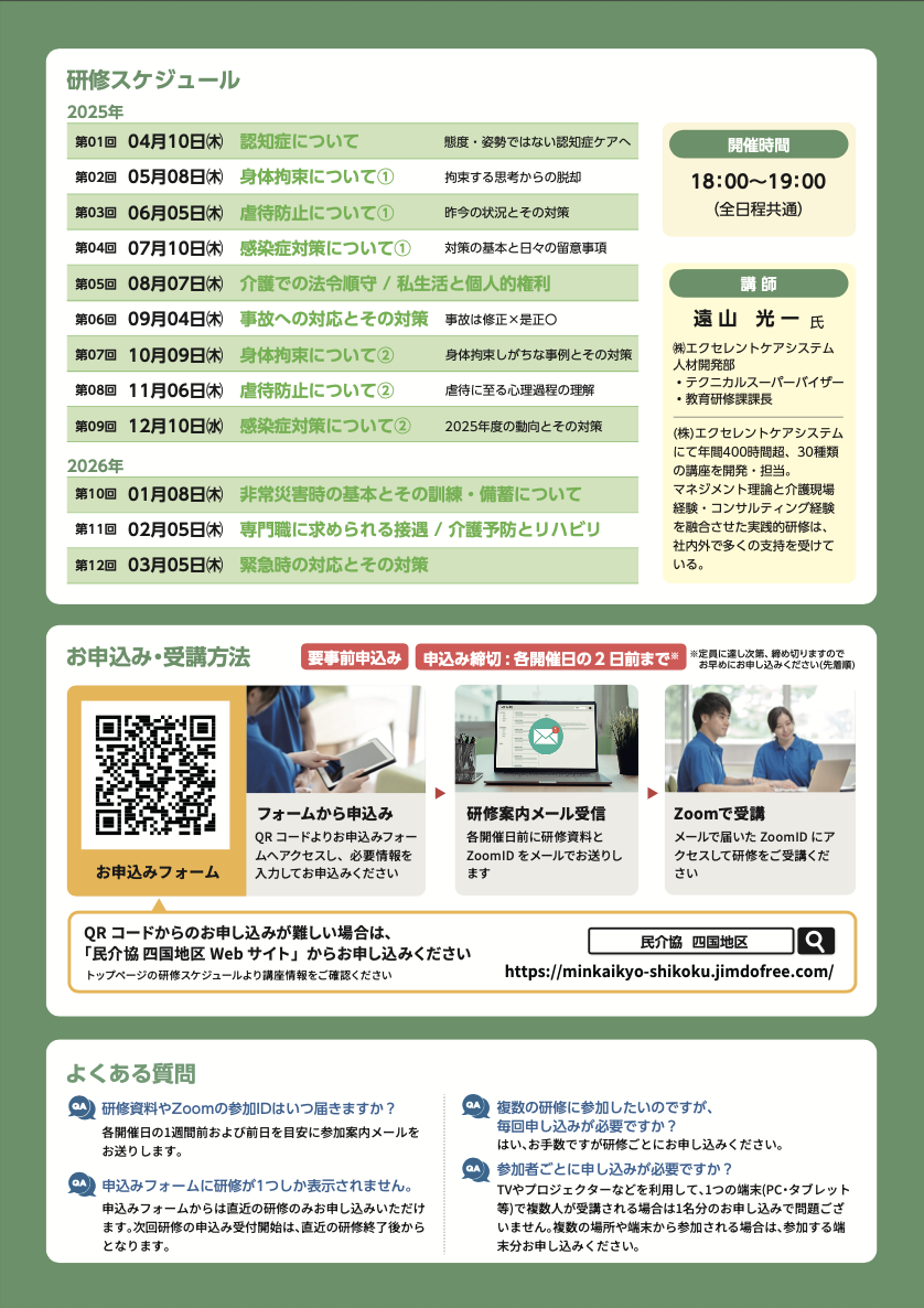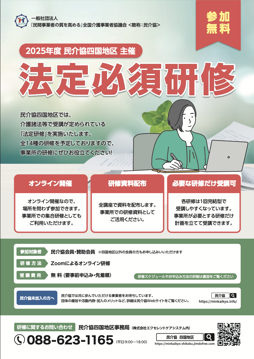 民介協四国地区では介護諸法等で必要とされる研修を毎月実施しております。